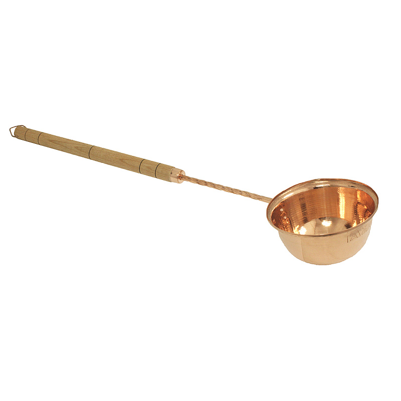 Небольшой медный черпак с деревянной ручкой, незаменимый аксессуар в любой бане или сауне. Медная чашка полностью исключает протекание.