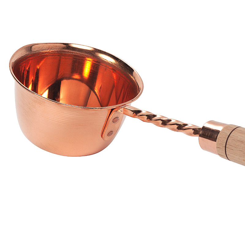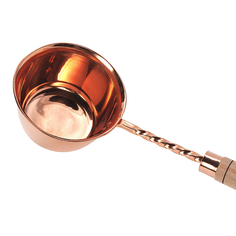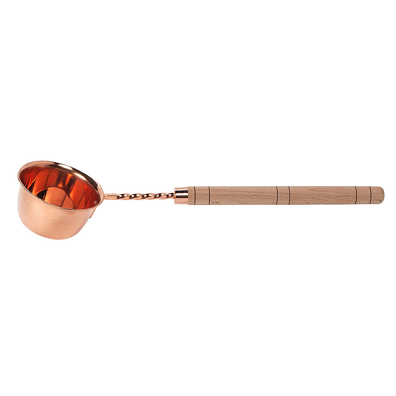 Небольшой медный черпак с деревянной ручкой, незаменимый аксессуар в любой бане или сауне. Медная чашка полностью исключает протекание.