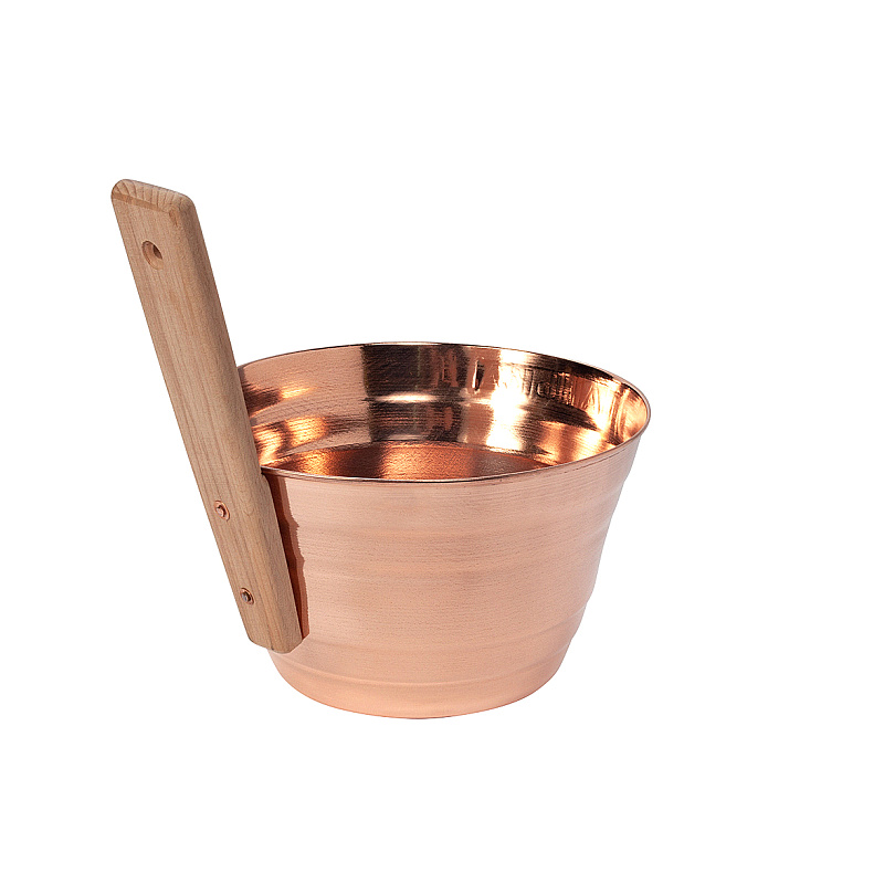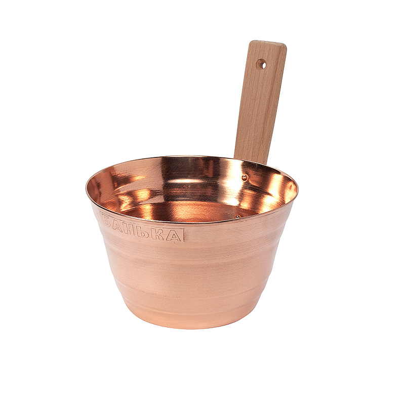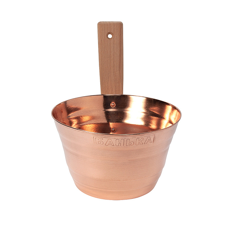 Ушат из меди с деревянной ручкой на 3 и 5 литров. Универсальная ёмкость для воды и необходимый аксессуар в любой бане или сауне. Удобная ручка из натурального дерева не обжигает кожу рук, а медная чаша прослужит долгие годы.