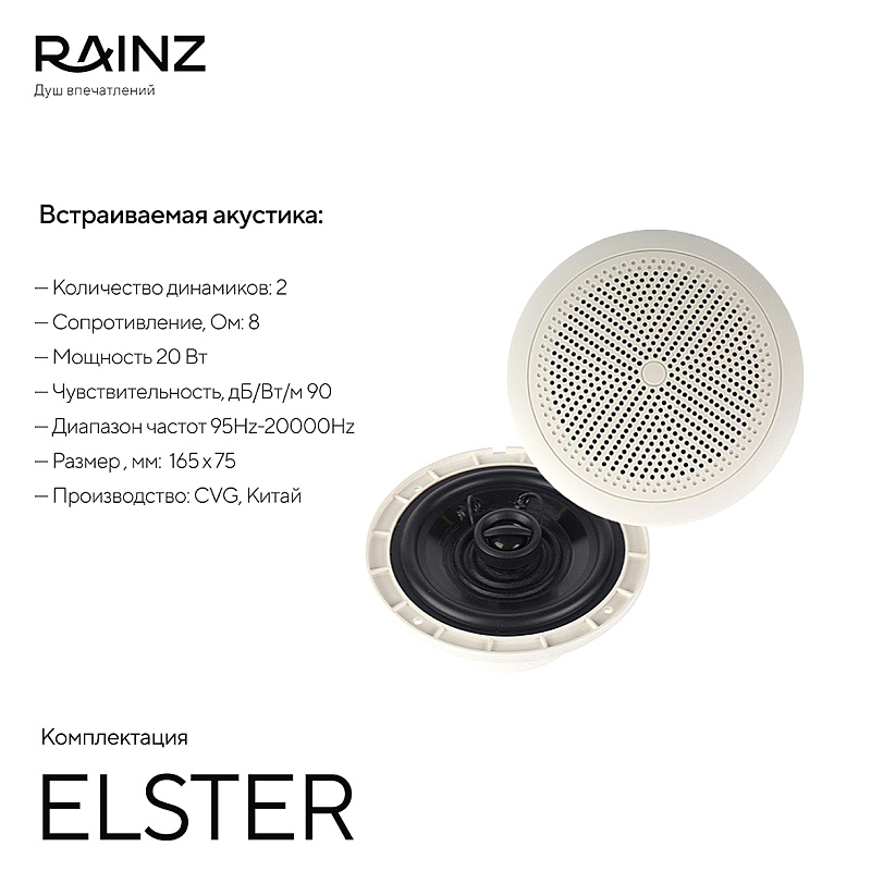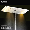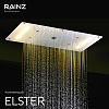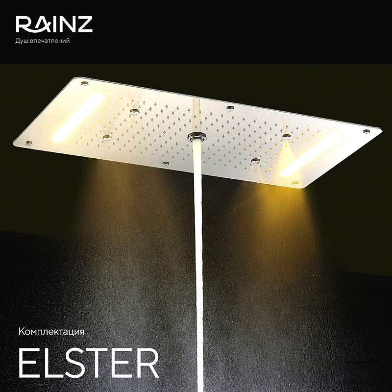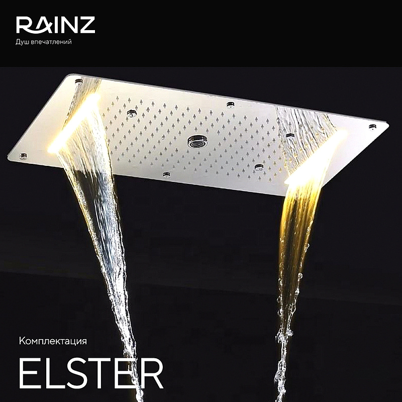 - Верхняя душевая лейка - нержавеющая сталь 304, цвет хром, страна производитель Германия/Китай, функции: дождь, водопад (2 форсунки), туман (распыление 4 форсунки), воздушные пузырьки, две широких панели RGB, подсветка интегрирована в Душ впечатлений RAINZ и работает под его управлением.