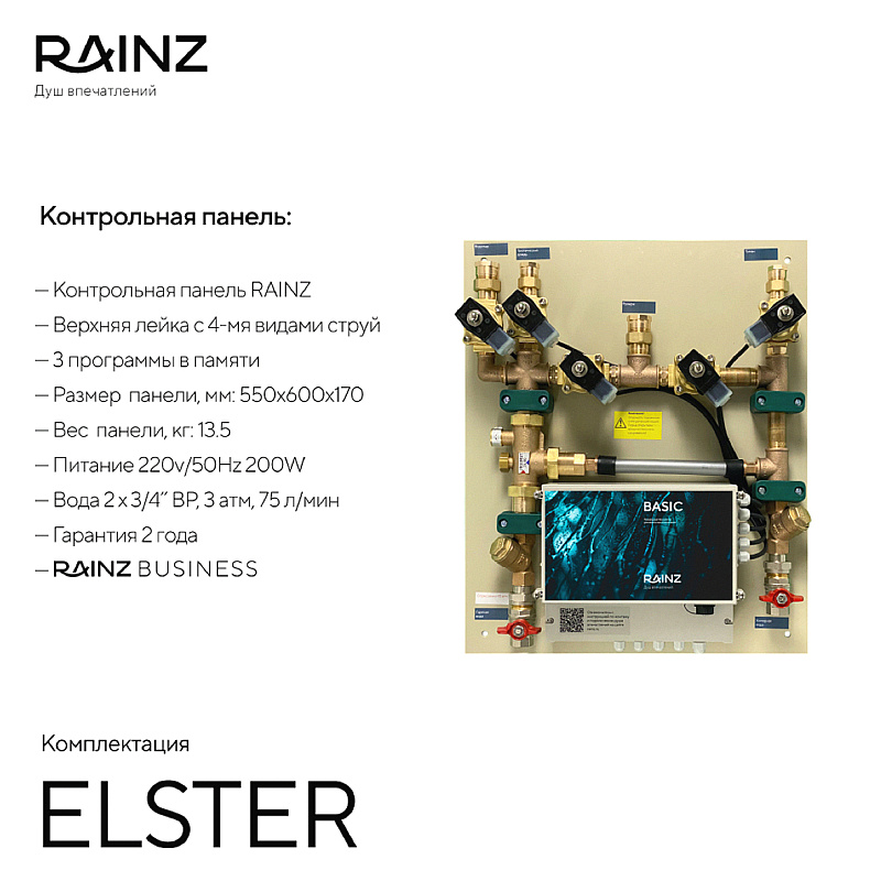 - Единая монтажная панель в сборе, включающая: контроллер управления форсунками, музыкой, светом(эффекты грозы и молнии, плавные переливы света, режим основного освещения, подключение к основному освещению с эффектом погружения, дополнительный выключатель сценарного освещения), термостат, комплект запорных кранов и фильтров. Управление 4 независимыми форсунками. 3 программы в памяти и возможность устанавливать новые программы. Гарантия на оборудование 2 года. Бизнес пакет.
