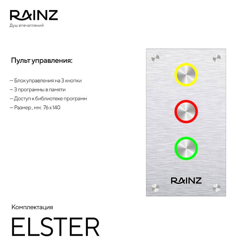 - Блок управления на три сенсорные пьезо-кнопки, с подсветкой. Удобная и безопасная при работе в условиях высокой влажности и под водой. С помощью умного интерфейса Душа впечатлений RAINZ позволяет запускать любую из 5 предустановленных программ одним нажатием. Каждый цвет соответствует одной программе. Работа с режимом "превью" программы или моментальным запуском.