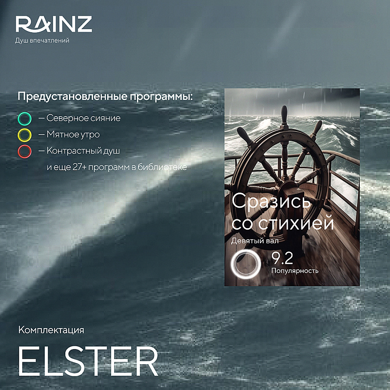 Душ впечатлений RAINZ - это симбиоз воды, света, музыки и ароматов в едином решении. Это пространство, которое подчиняется вашим желаниям и управляется всего одной кнопкой.