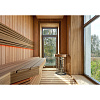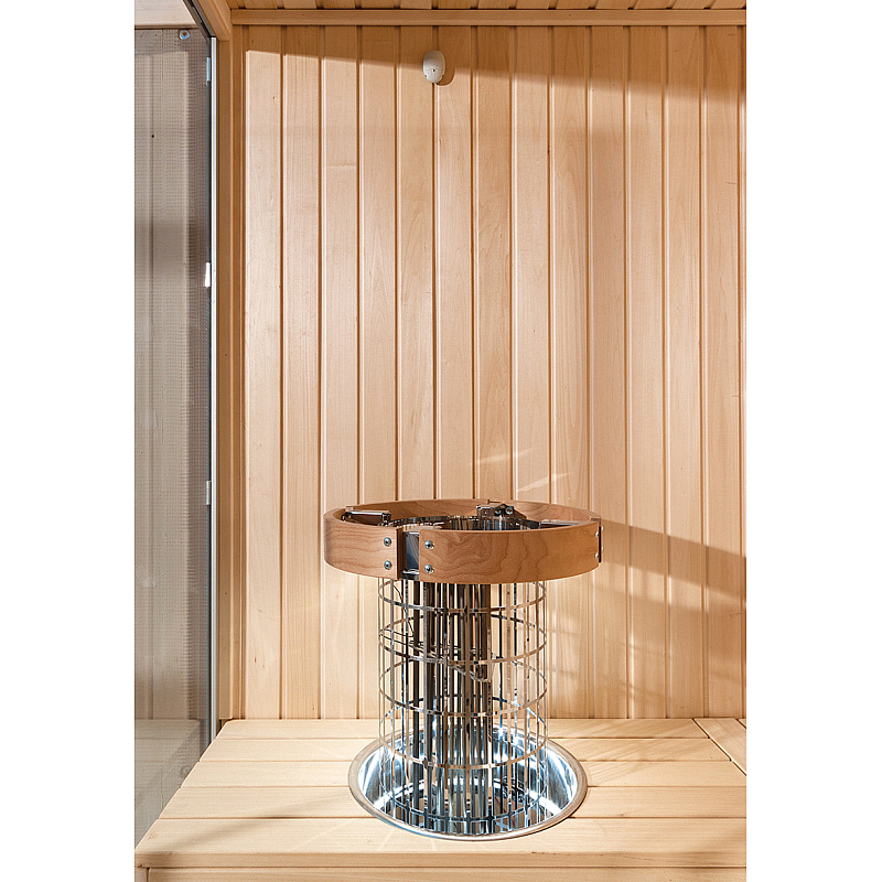Неизолированные стены (кирпич, стеклянные блоки, стекло, бетон, керамическая плитка и т.д.) повышают требуемую мощность нагревателя. Необходимо добавить 1,2 куб.м к объему сауны на каждый неизолированный кв.м стены. Например, сауна объемом 10 куб.м со стеклянной дверью эквивалентна сауне объемом 12 куб.м по мощности каменки.