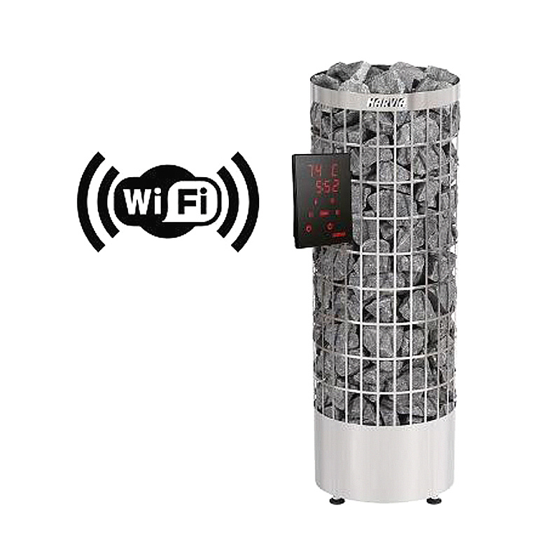 Серия печей Cilindro WiFi комплектуется выносной сенсорной панелью с возможностью дистанционного управления. Она позволяет задавать температуру в парилке, время включения и выключения печи, а также время задержки включения.