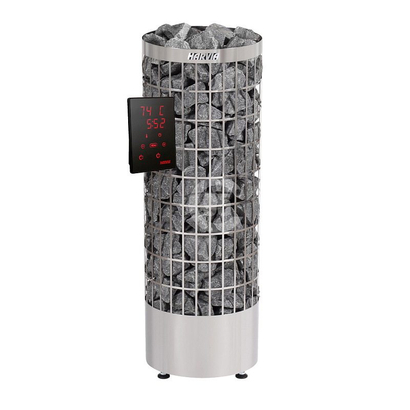 Серия печей Cilindro XE комплектуется выносной сенсорной панелью, позволяющей задавать температуру в парилке, время включения и выключения печи, а также время задержки включения.