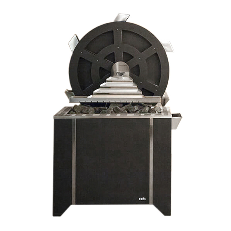 Колесо «Мельницы» своим движением создает атмосферу расслабленности. Ковши, расположенные на концах, зачерпывают воду, и поливают ей камни печи, заполняя пространство облаками густого насыщенного пара. Колесо мельницы с приводным механизмом и системой автоматического долива воды дополняет печь Goliath, выполненную в цвете антрацит с перламутровым эффектом.