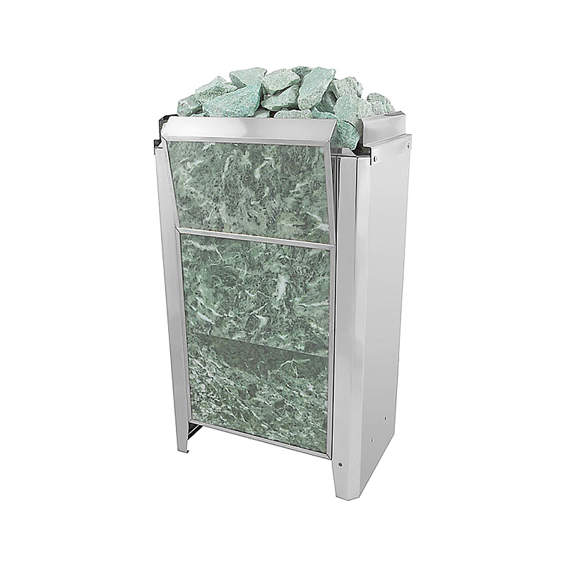 Электрокаменка Kristina Classic – печь с ленточным нагревателем, выполненная из нержавеющей стали с облицовкой из природного камня змеевика. В отличие от трубчатых тенов, используемых в печах Harvia, Helo и других производителей, ленточный нагреватель обеспечивает значительно большую излучаемую поверхность, создавая температуру 400-500 градусов, по сравнению с 700-800 градусами на поверхности классического тена.