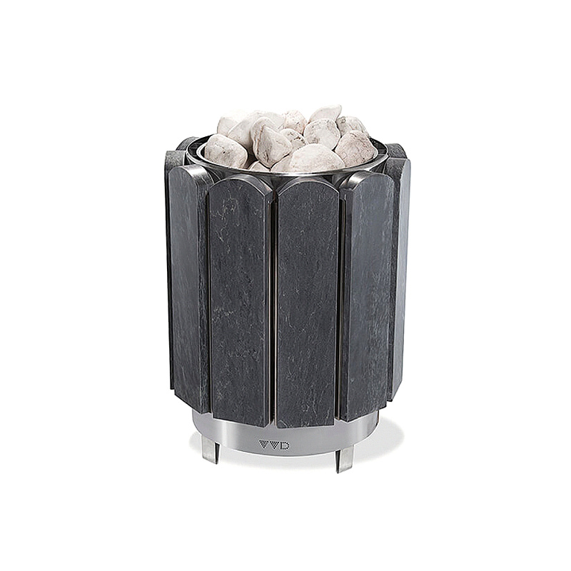 Круглая форма печи обеспечивает гибкость размещения в парном помещении, включая его центр. Благодаря большой суммарной массе каменного объема печь обладает высокой теплоаккумулирующей способностью, что позволяет эффективно стабилизировать температурный режим. Использование с электрическими ТЭНовыми нагревателями обеспечивает интенсивное парообразование, а также снижает цикличность включения и выключения, продлевая срок службы устройства. Высокие эксплуатационные характеристики и надежность печи позволяют использовать её, в том числе, в коммерческих саунах. Для контроля за работой печи рекомендуется приобрести блок управления ПУ-01 М или ПУ-08 .