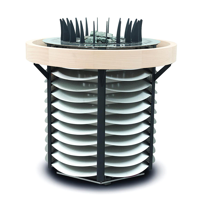 Печь Shark - это вызов привычному укладу и стандартным конструкциям. Корпус печи круглый, выполнен в виде колец, а заканчивается конструкция открытой корзиной для камней, со своеобразной «короной» с острыми зубцами, по форме напоминающими плавники акулы.