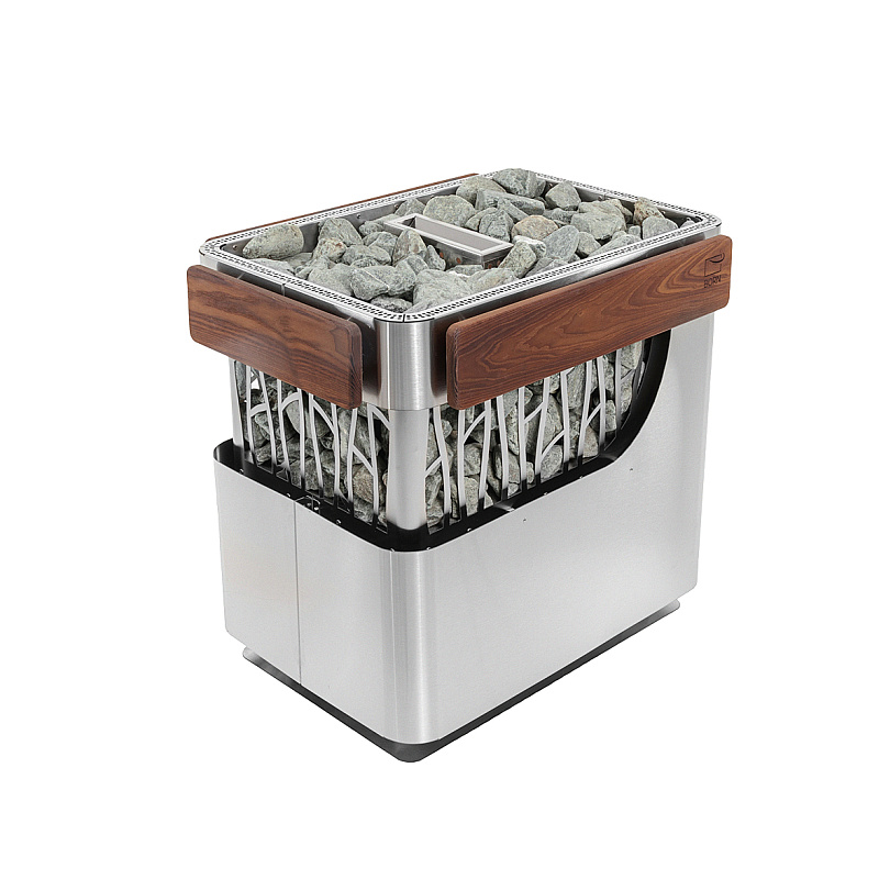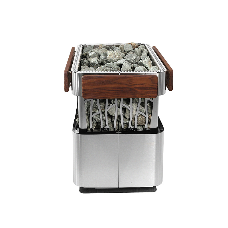 Каменка изготовлена из высококачественной матовой нержавеющей стали AISI 304 с декоративными элементами из ясеня.