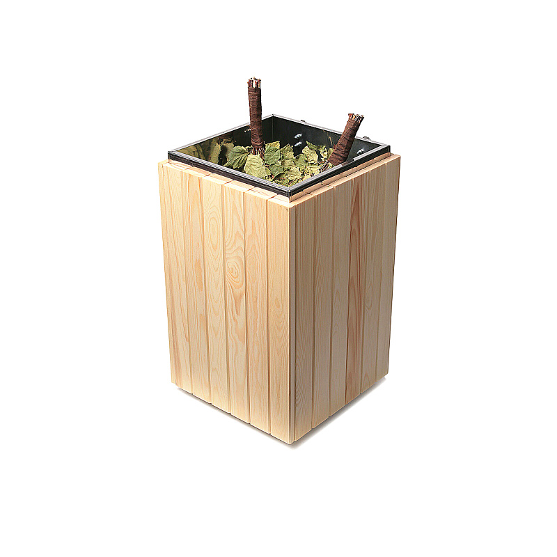 Корпус оформлен декоративными деревянными планками в цвете – либо «красное дерево», либо «сосна», которые одновременно являются и защитным и теплоизолирующим материалом. В середину дна впаян сливной медный патрубок диаметром 15мм, закрывающийся специальной силиконовой пробочкой. На дне изделия находится перфорированная решетка, препятствующая погружению веников в воду.