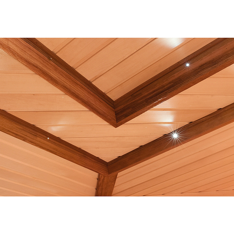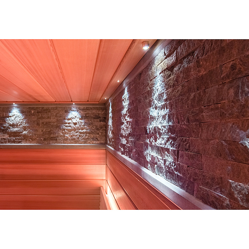 Проектор со степенью защиты IP65 может размещаться внутри сауны под полком. Источником света служит светодиод 16 Вт теплого света (2700 К)
