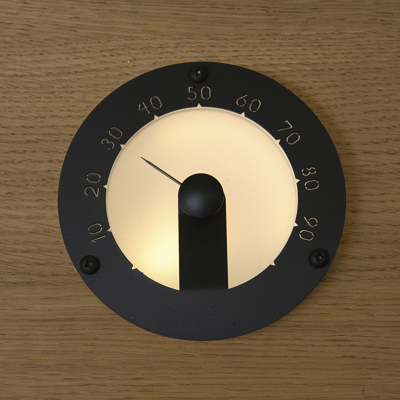 Устанавливается при обшивке сауны. Диаметр термометра 120мм, глубина ниши для установки 40 мм. Выступает над поверхностью обшивки на 20 мм.