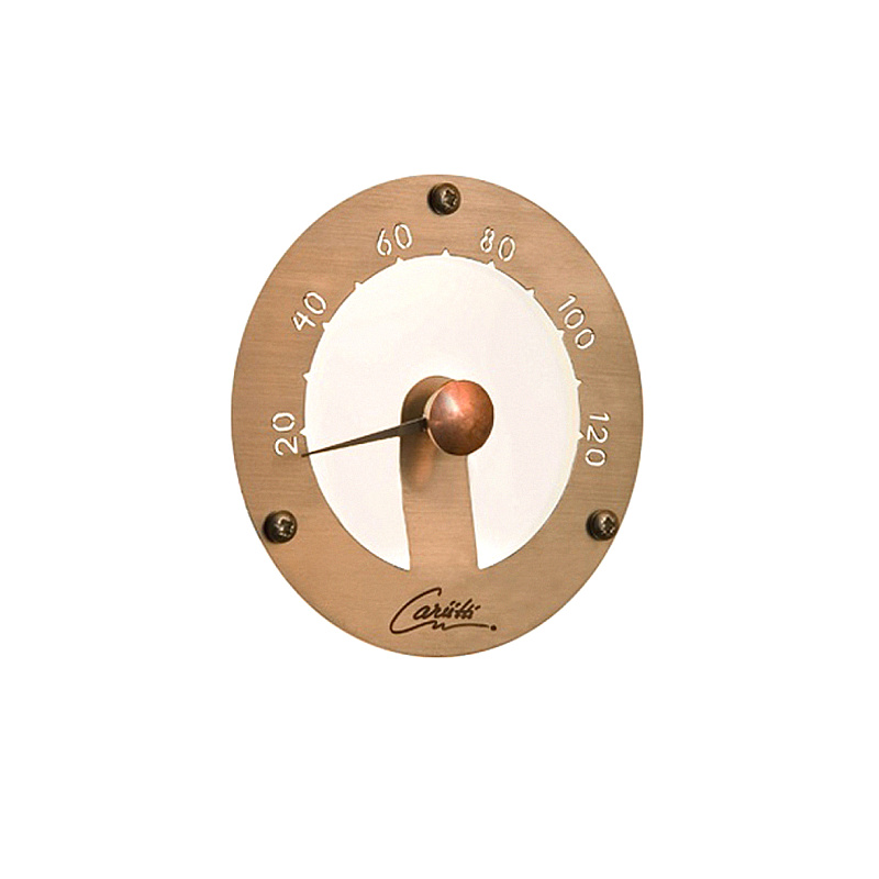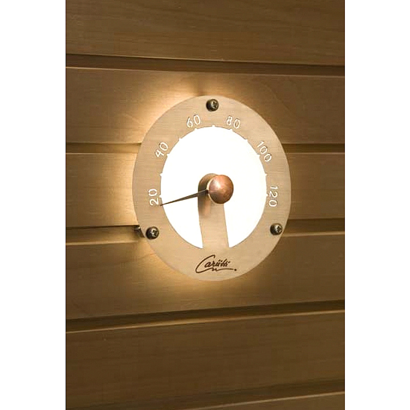 Устанавливается при обшивке сауны. Диаметр термометра 120мм, глубина ниши для установки 40 мм. Выступает над поверхностью обшивки на 20 мм.