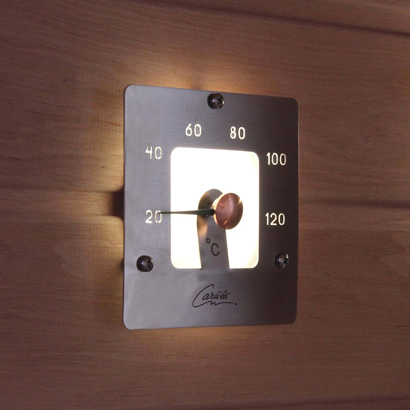 Устанавливается при обшивке сауны. Размер термометра 120 х 120 мм, глубина ниши для установки 40 мм. Выступает над поверхностью обшивки на 20 мм.