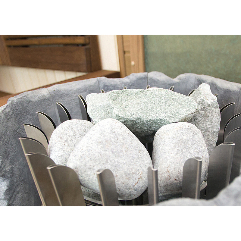 Для решения этой задачи мы рекомендуем применять облицовки закрытого типа, которые позволяют хорошо раскалить камни в закрытом объеме (прибавка около 100 градусов) и управлять температурой в парной открыванием дверцы. При этом тепло излучаемое от талькомагнезита гораздо мягче и комфортнее чем от раскаленного металла. На растопку печи в облицовке вы затратите 1,5-2 часа, но даже после прогорания дров можно будет на протяжении 4-5 часов принимать банные процедуры. Талькомагнезит уникальный по своей природе камень, нагреваясь, он очень медленно остывает, тем самым поддерживая температуру в парной, а камни при этом охлаждаются существенно меньше, нежели в открытых печах. Мы используем в производстве облицовок талькомагнезит от компании Tulikivi добытый в Финляндии.