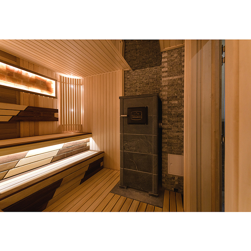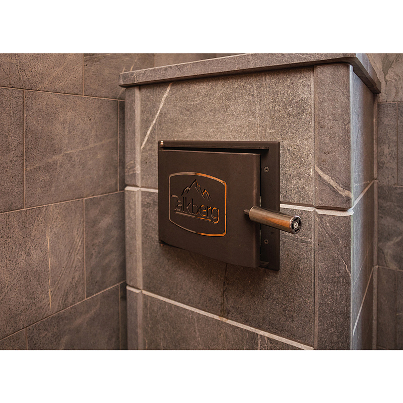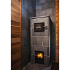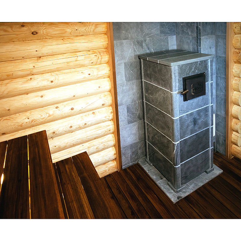 Но нагревая камни в обычной каменке мы будем одновременно нагревать и сушить окружающее пространство, и эта зависимость линейна.Для решения этой задачи мы рекомендуем применять облицовки закрытого типа, которые позволяют хорошо раскалить камни в закрытом объеме (прибавка около 100 градусов) и управлять температурой в парной открыванием дверцы. При этом тепло излучаемое от талькомагнезита гораздо мягче и комфортнее чем от раскаленного металла. Данная модель облицовки идет в комплекте с баком для камней который устанавливается на печь и через него проходит дымоход разогревая окружающие его камни. На растопку печи в облицовке вы затратите 1,5-2 часа, но даже после прогорания дров можно будет на протяжении 4-5 часов принимать банные процедуры. Талькомагнезит уникальный по своей природе камень, нагреваясь он очень медленно остывает, тем самым поддерживая температуру в парной, а камни при этом охлаждаются существенно меньше нежели в открытых печах.