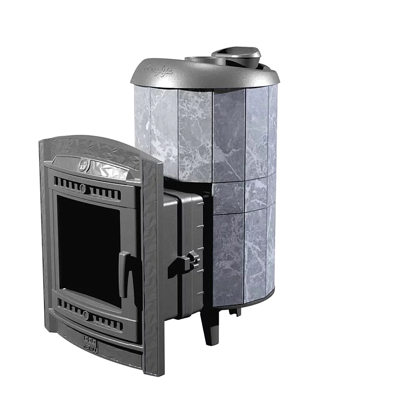 Практичная и компактная модель. Облицовка из талькохлорита по периметру внешней каменки не только обладают хорошими теплонакопительными свойствами, но и придают печи оригинальный внешний вид. Модель с усиленной каменкой.