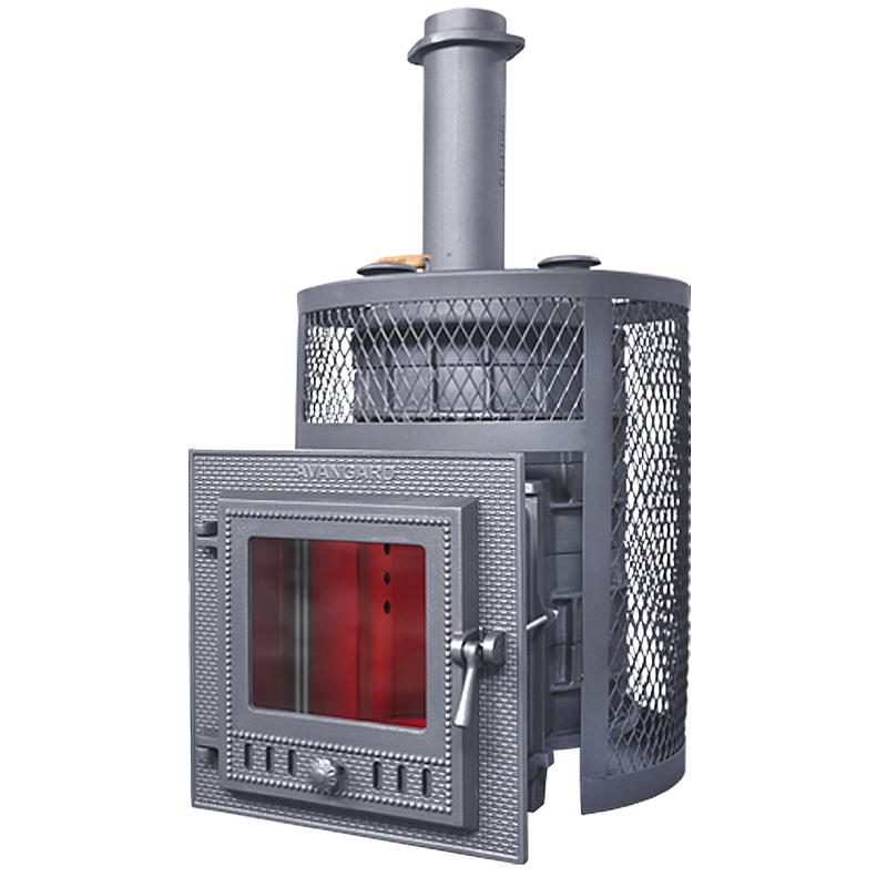 Масса пароиспарителя в печи Аванград 30-56 кг, и он нагревается прямым контактом с пламенем. У пароиспарителя 2 поверхности с увеличенной рабочей площадью – снизу идёт нагрев огнём, а сверху поддаётся вода для пара. Для увеличения площади испарения и нагрева первых слоёв камней на каменке отлиты высокие шипы.