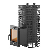 Печь и сетка внешней каменки цилиндрической формы, компактная и удобно размещаемая в парилке. Выносной тоннель при монтаже печи проводится через стену и предполагает обслуживание печи из смежного помещения.