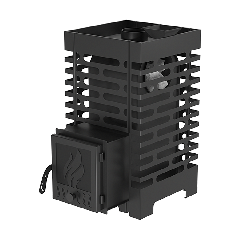 • Глубокая невентилируемая каменка-труба из стали 09Г2С прогревается открытым пламенем для максимального нагрева камней, заложенных в нее и выполняет роль пламегасителя.