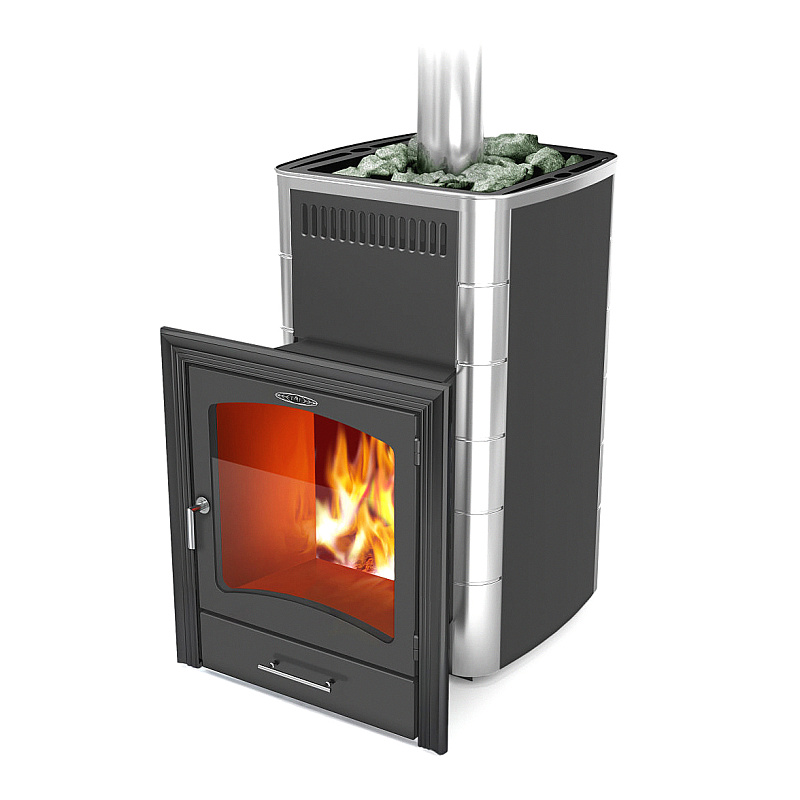 Печь сочетает в себе мощную банную печь и большой красивый камин. Мощная банная печь и красивый большой камин, как две сибирские реки, слились воедино.Лабиринтный газоход обеспечивает мощный скоростной нагрев парилки объемом до 30 м3 и качественный прогрев каменной закладки массой около 100 кг.