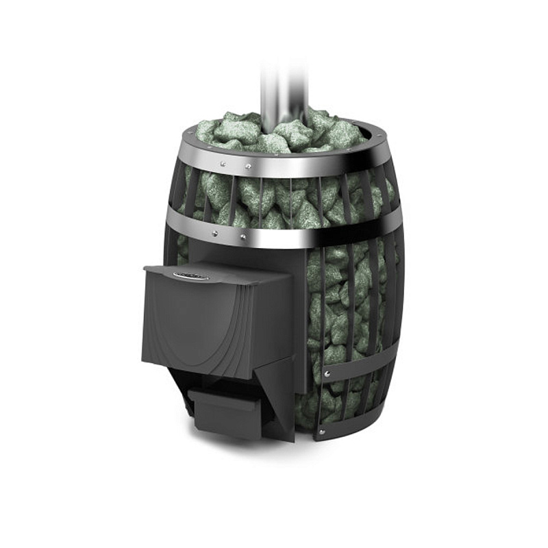 В печи предусмотрена двухступенчатая система парообразования с закрытой каменкой и клапаном-дозатором. В конструкции клапана так же использован клапан мотылькового типа, который максимально быстро пропускает порцию воды в объем первичной каменки, и еще быстрее запирается после этого. Благодаря этому практически исключен выброс пара в зоне клапана, а вся поданная вода гарантированно превращается в мелкодисперсионный легкий пар.Закрытая каменка прогревается круговым потоком пламени со всех сторон.
