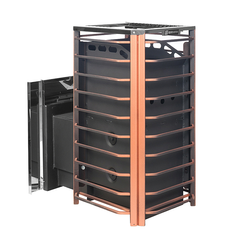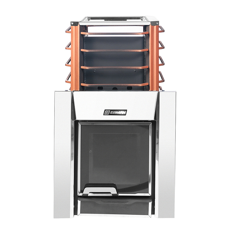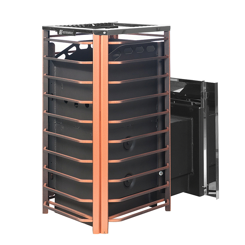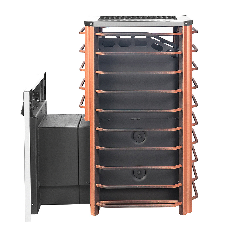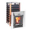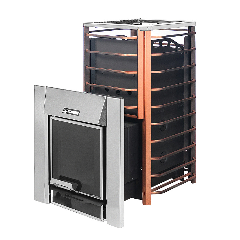 Банная печь с большой загрузкой камней, что обеспечивает длительную отдачу тепла. В качестве опций возможно установить теплообменник и парообразователь. Дверца с панорамным стеклом имеет возможность лево- и правостороннего открывания.