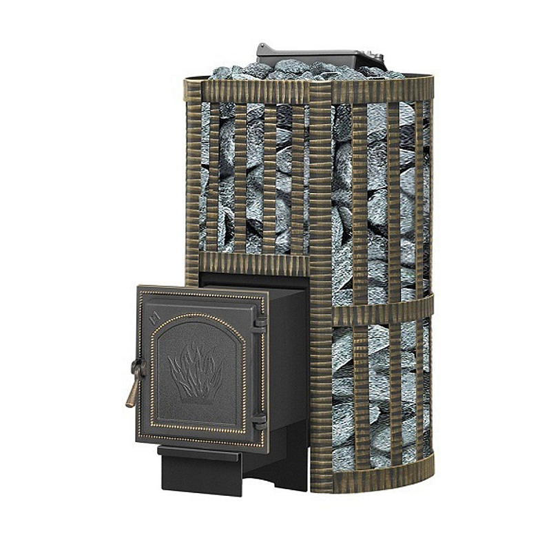 Емкость закрытой каменки стальная и вмещает в себя около 60 кг камней. Декоративный кожух «Ковка» изготовлен из металлической текстурированной полосы покрашенной термостойкой краской и патиной «Бронза».