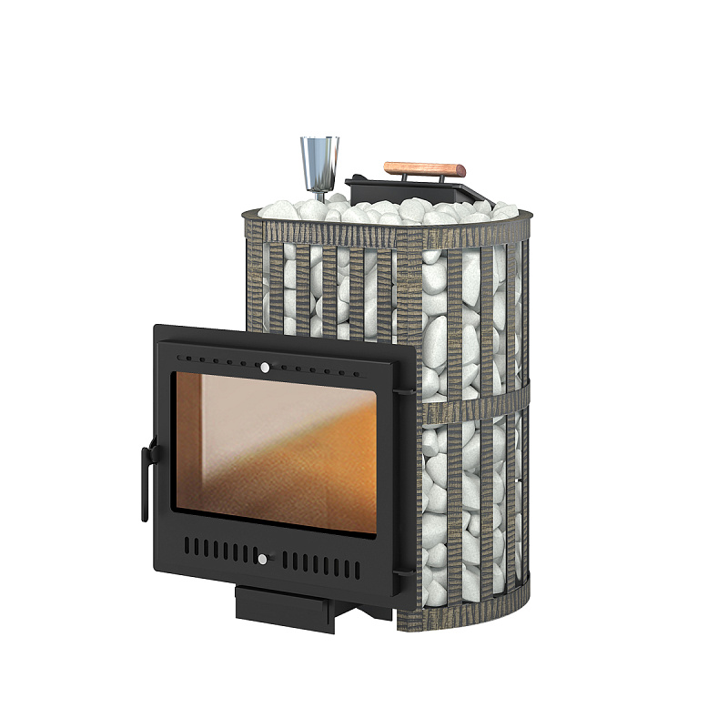 Емкость закрытой каменки стальная и вмещает в себя около 60 кг камней. Декоративный кожух «Ковка» изготовлен из металлической текстурированной полосы покрашенной термостойкой краской и патиной «Бронза».