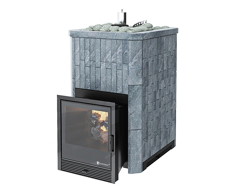 Печь оснащена съемной закрытой каменкой, топка печи футерована шамотными плитами. В стандартную комплектацию печи входит индивидуально разработанный кожух из натурального камня толщиной 40 мм с регулируемой конвекцией.
